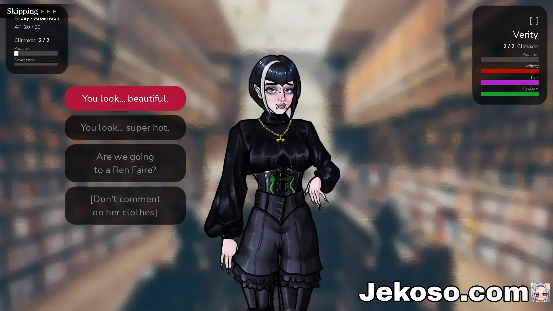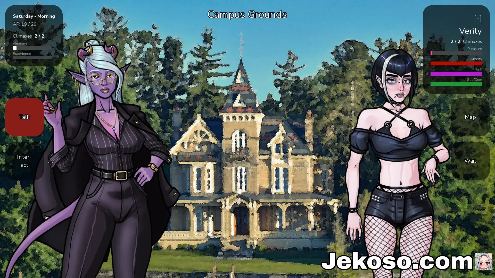 Interacciones contextuales: se agregaron rechazos basados ​​en estadísticas graduados (más suaves), diálogo condicional para besarse con semen en la cara y escenas posteriores al sexo alteradas cuando un personaje está enojado.